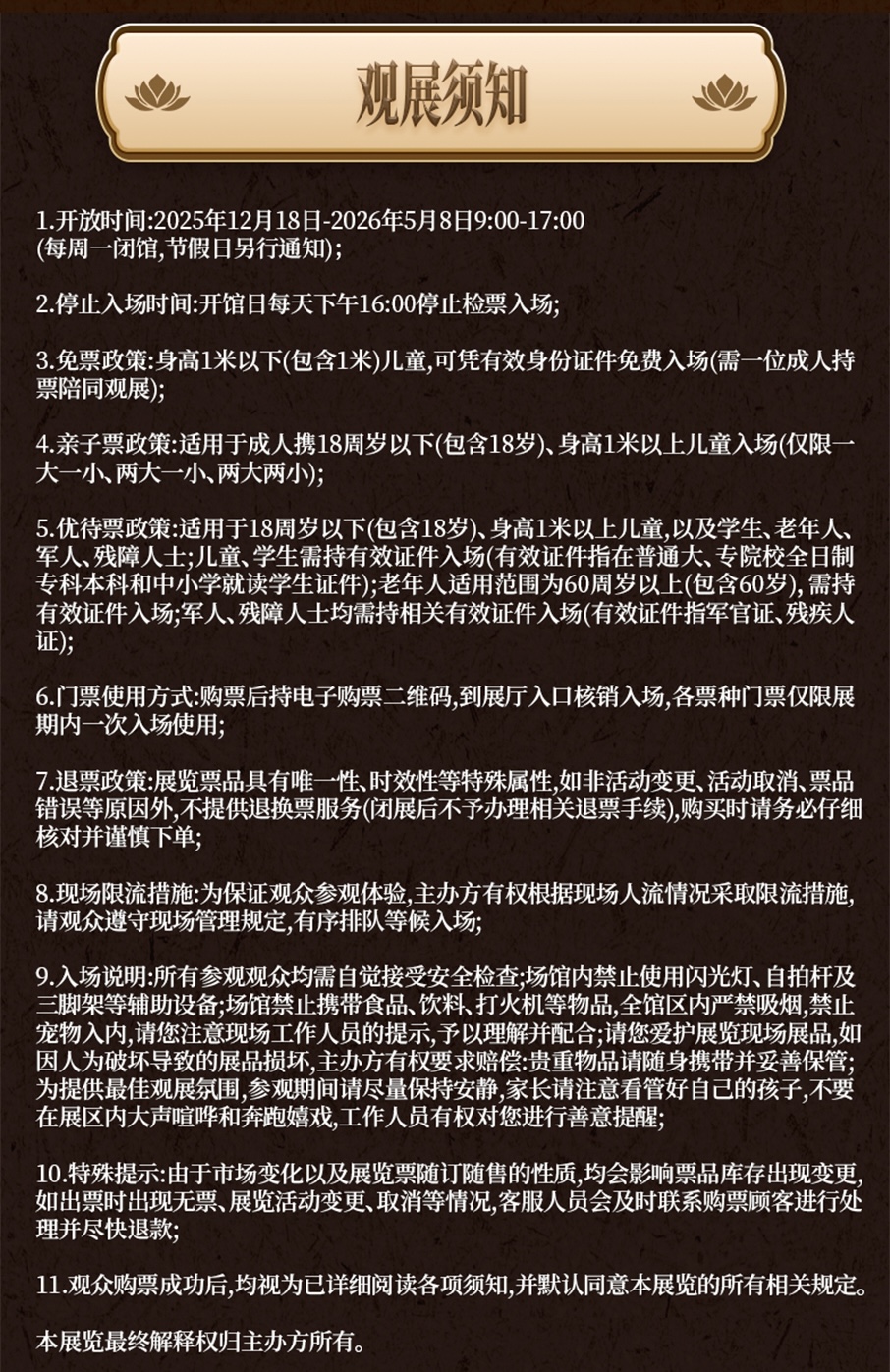 免票政策:身高1米以下(包含1米)儿童免费入场(需一位成人持票陪同观展)。
