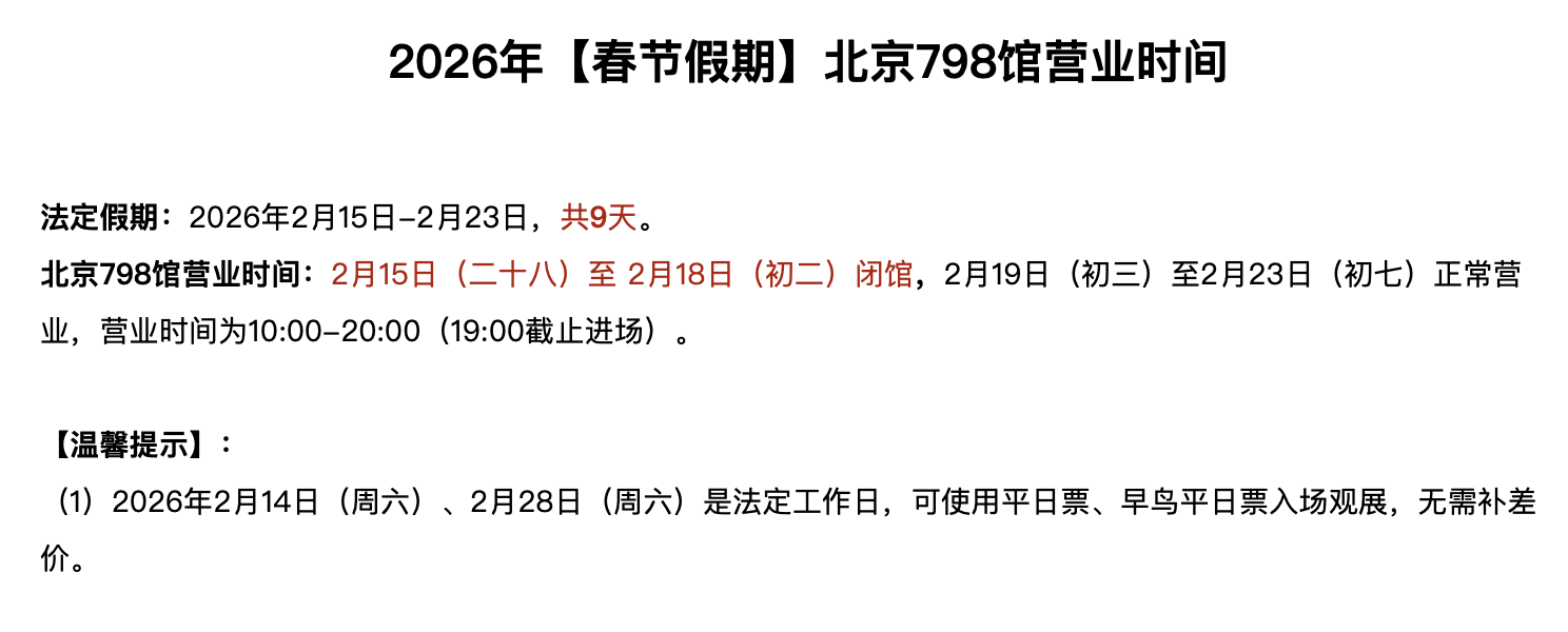 展期:2026年2月4日-2026年3月29日,营业时间:周二至周四:10:00-18:30(17:30停止入场) 周五:10:00-19:00(18:00停止入场) 周末&法定节假日:10:00-20:00(19:00停止入入场) (特殊活动入场时间请以活动实际入场时间为准)